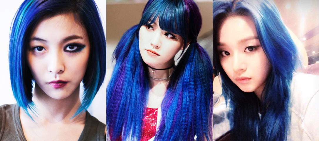 E quem disse que azul é cor de menino? As garotas arrasam com essa cor SIM, e ai de quem reclamar! Para o MV de "Red Light", Luna marcou presença com o cabelo esbanjando muita cor e poder! Essa gata só me destrói. Lime, do Hello Venus, ousou um pouquinho mais para "I'm Ill" e misturou o azulão com umas mechas roxas, que só poderia resultar em sucesso, né? E apesar de ser muito talentosa, minha queridinha Z.Hera é praticamente uma desconhecida no K-Pop. Durante as promoções de "D Island", ela apostou num cabelão super azul que destacou ainda mais sua beleza.